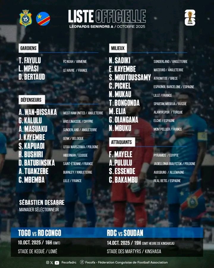 Ci-dessous la liste de 25 joueurs convoqués par le coach, Sébastien Desabre