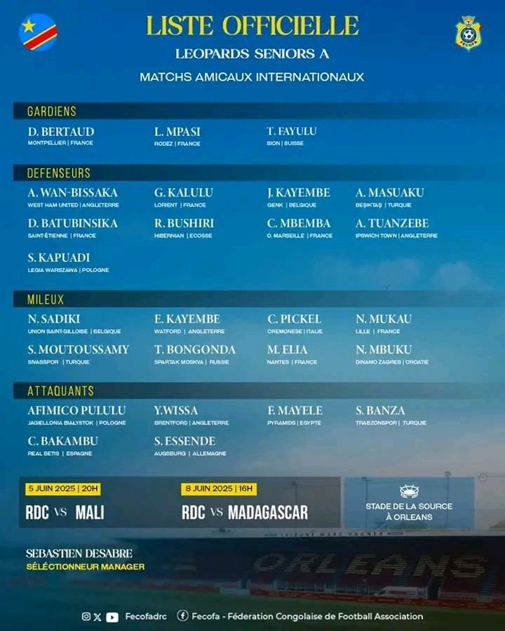 À l’approche de la trêve internationale de juin, le sélectionneur des Léopards de la RDC, Sébastien Desabre a rendu publique une liste de 26 joueurs, ce jeudi 8 mai 2025 via les canaux officiels de la FECOFA. Ces joueurs participeront à deux matchs amicaux contre le Mali (5 juin) et Madagascar (8 juin) à Orléans, en France, au Stade de la Source.