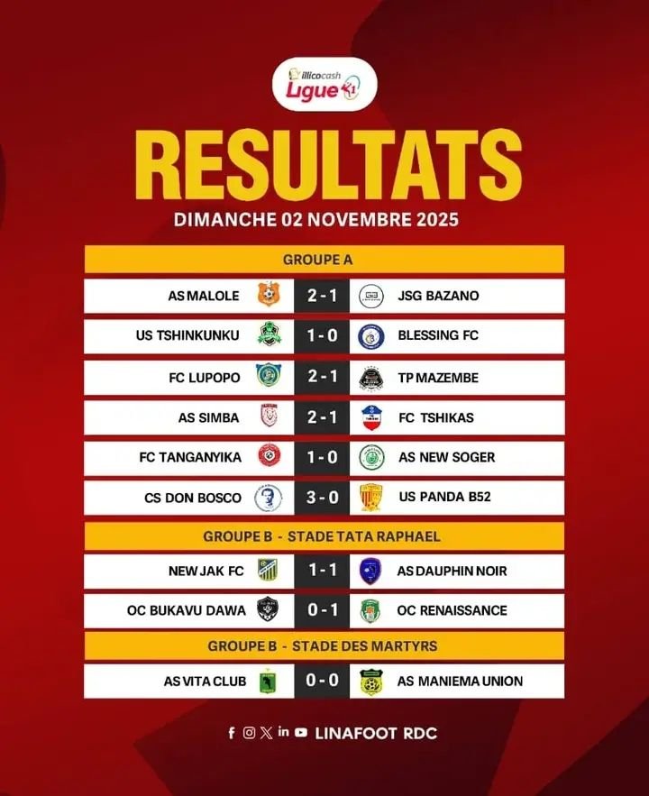 Le championnat national congolais Illicocash Ligue 1, a offert une 4e journée spectaculaire ce dimanche 2 novembre 2025 à travers plusieurs villes et provinces de la République Démocratique du Congo. Parmi les affiches phares, le derby lushois entre le FC Saint-Éloi Lupopo et le TP Mazembe qui a tenu toutes ses promesses ainsi que le derby fratricide opposant l’As V.club à l’As Maniema Union de Kindu.