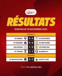 Le championnat national Congolais illicocash ligue 1 s’est poursuivi ce dimanche 16 novembre 2025 avec 5 affiches au programme dont 4 du groupe A et 1 du groupe B. l’As V.club contre l’OC Bukavu Dawa et TP Mazembe face à New Soger ont été les rencontres phares.