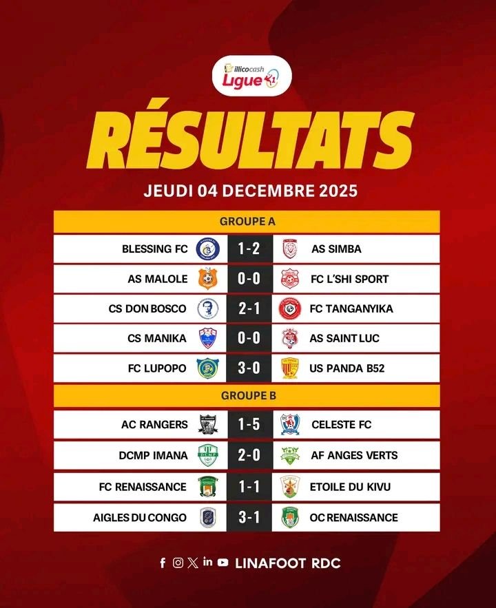 Ce jeudi 04 décembre 2025 a été marqué par la poursuite du championnat national Congolais illicocash Ligue 1 avec 9 affiches alléchantes au programme respectivement 5 matchs du groupe A, et 4 du groupe B. Cette journée est dominé par la victoire colossale du Saint Eloi Lupopo et du FC les Aigles du Congo.