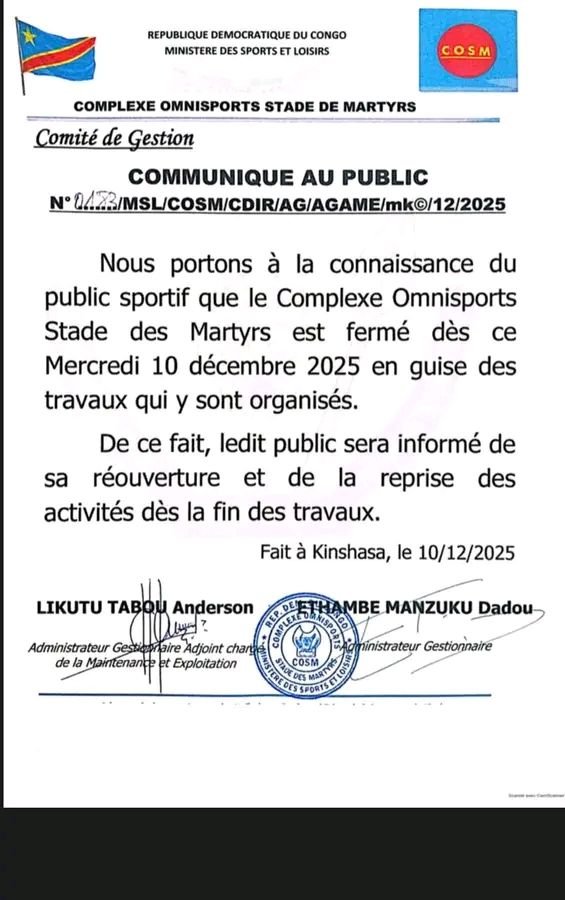 Le comité de gestion du stade des Martyrs a annoncé, dans un communiqué officiel publié ce mercredi 10 décembre 2025, la fermeture temporaire de l’enceinte pour des travaux de réhabilitation. Cette décision implique l’arrêt de toutes les activités sportives dans la plus grande infrastructure footballistique du pays jusqu’à la fin des travaux.